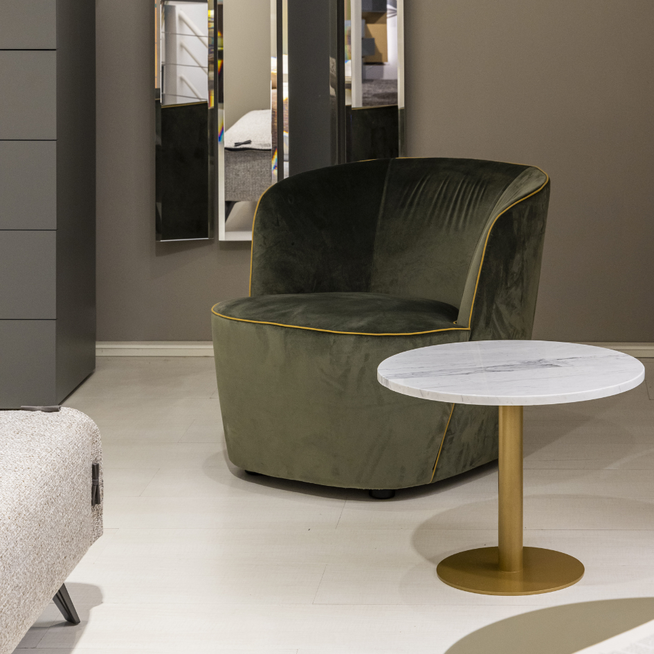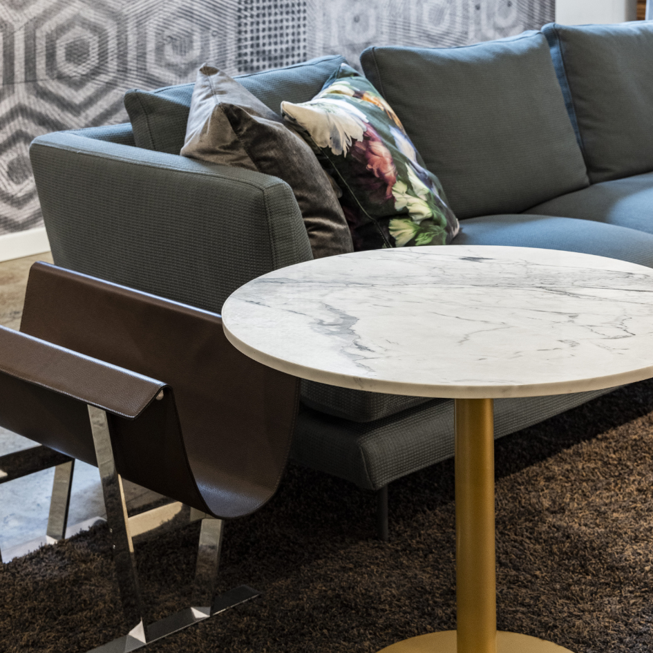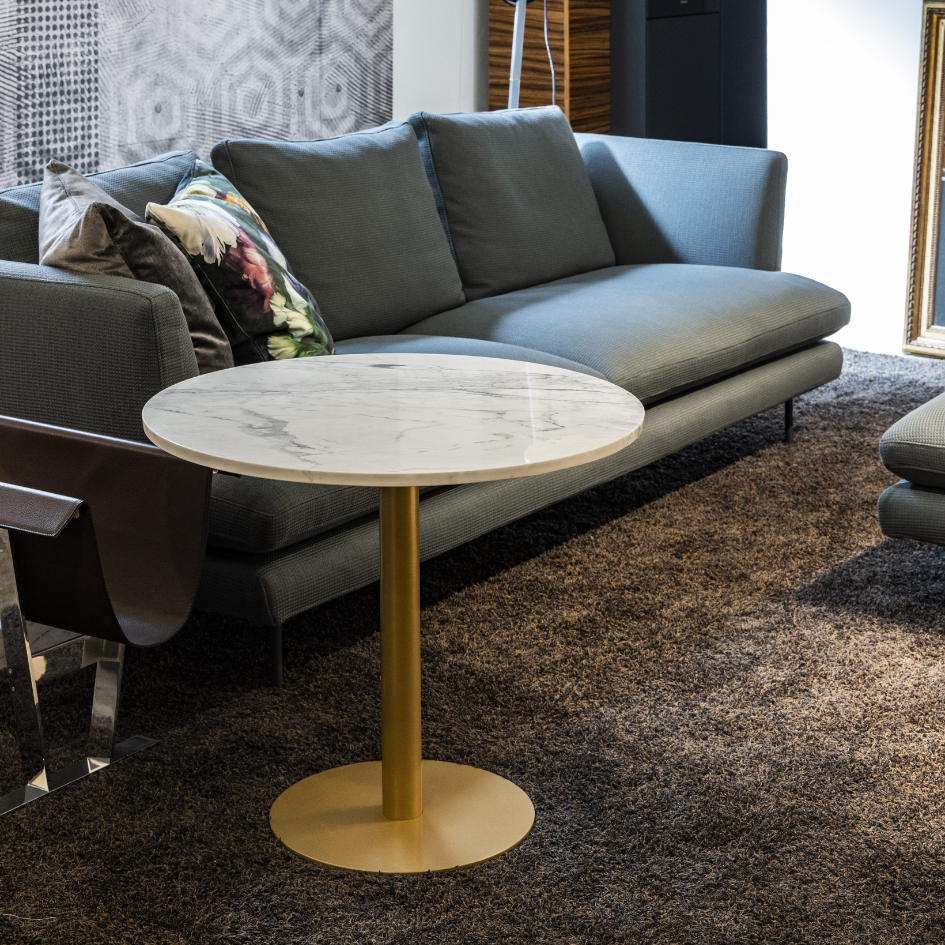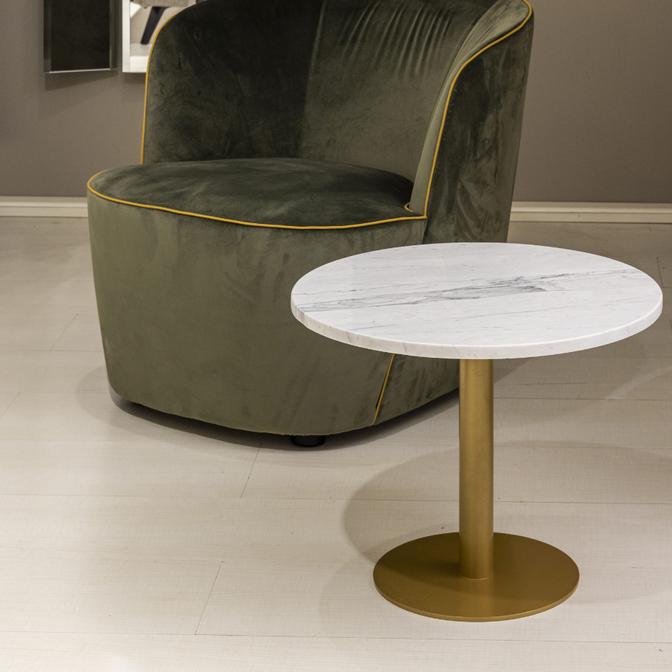 Tavolo tondo con top in marmo e base in metallo. Interamente lavorato a mano.