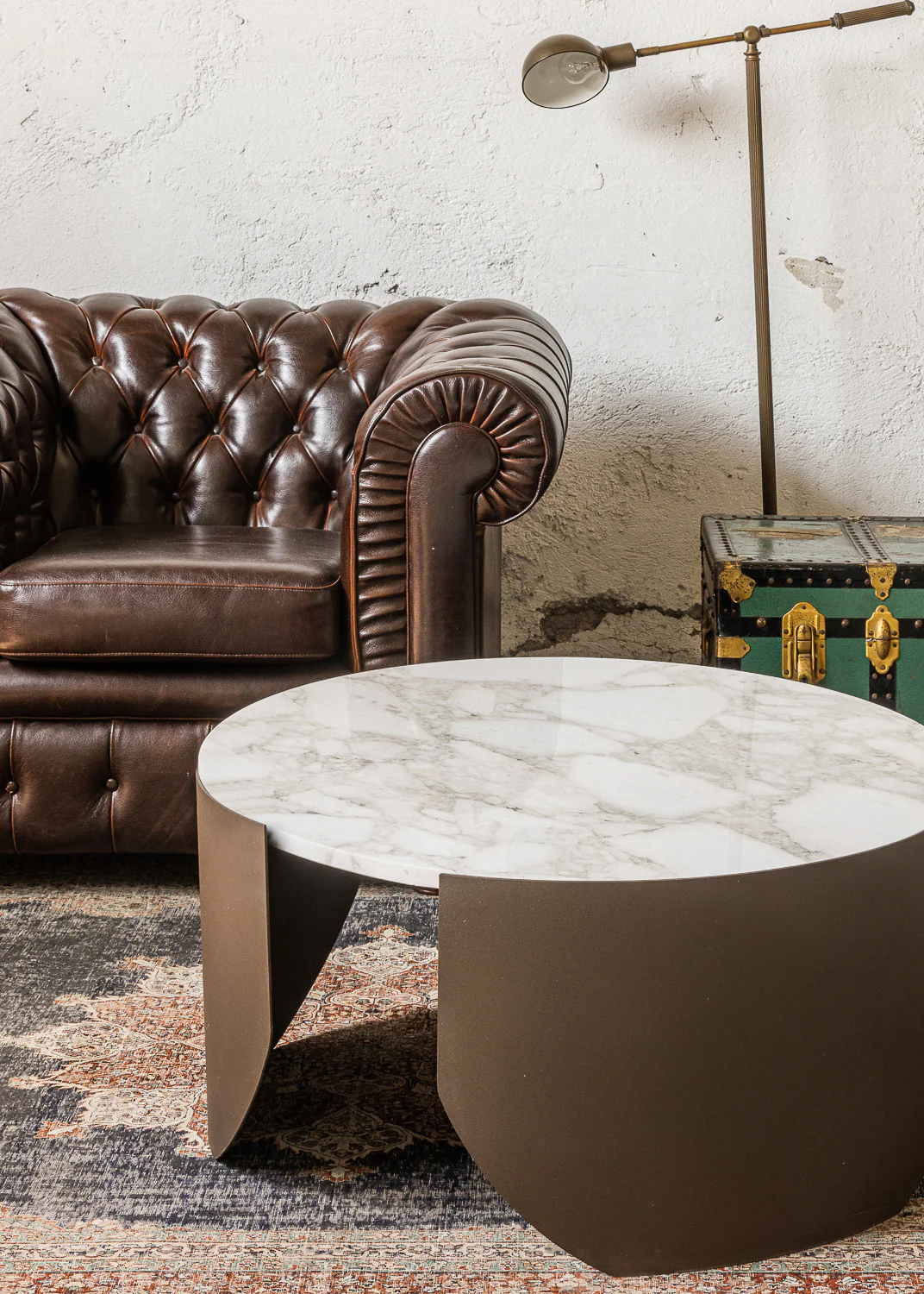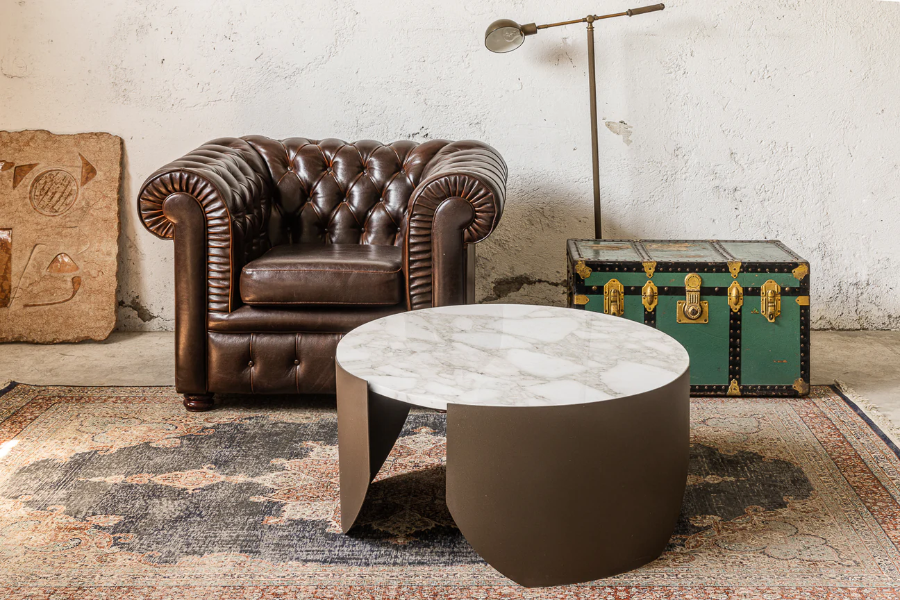 Coffee table con composto da lamiere riverniciate con top di marmo a scomparsa