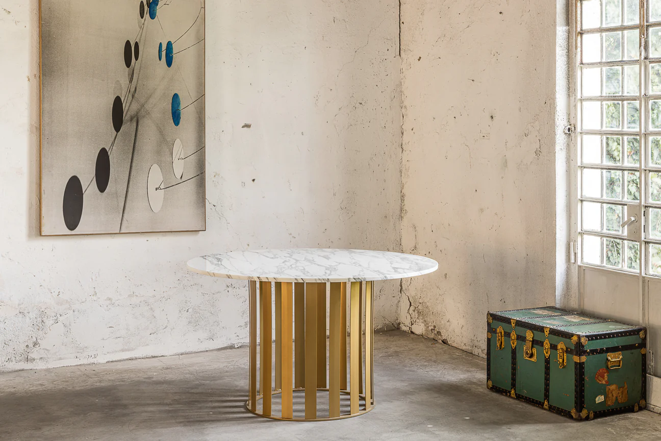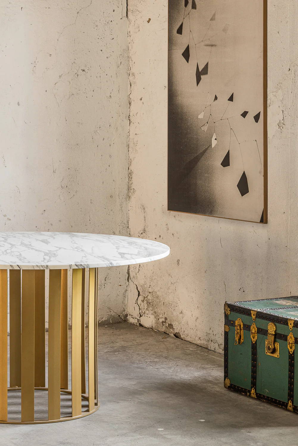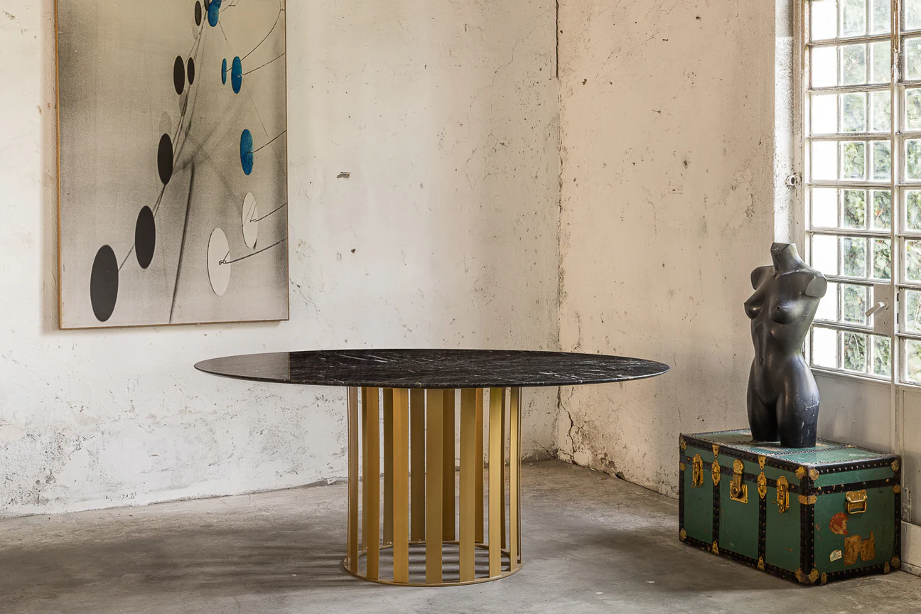 Tavolo rotondo o ovale con top in marmo lavorato a mano e basamento circolare in ferro verniciato ad arte