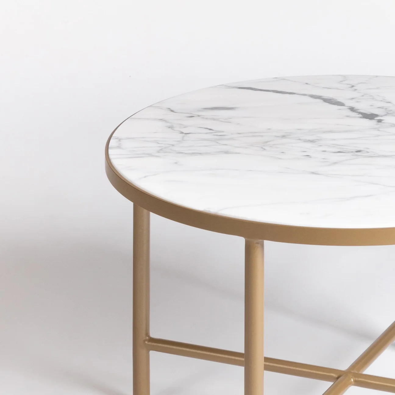 Tavolo tondo con top in marmo e base in metallo. Interamente lavorato a mano.