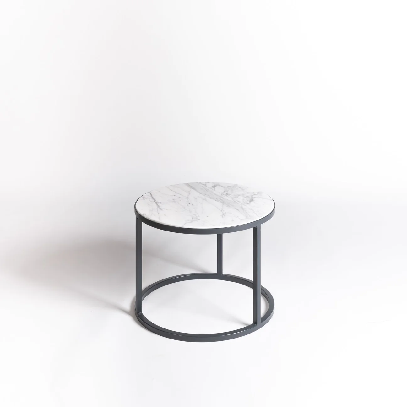 Coppia di tavoli tondi con top in marmo e base in ferro. Interamente lavorato a mano.